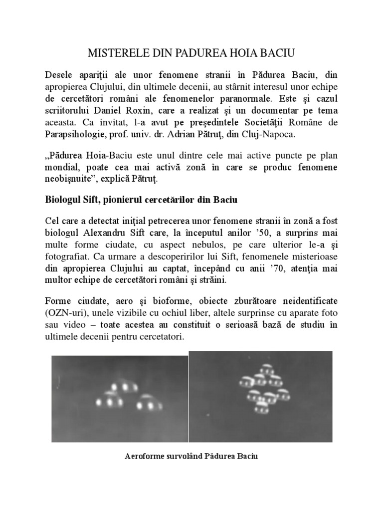 „toată lumea a fost prietenoasă cu noi. Padurea baciu acopera coasta unui deal, aflat la doar cativa kilometri de orasul cluj. Hoia baciu a fost numită cea mai înfiorătoare pădure din lume, iar poiana rotundă este cel mai ciudat loc din pădure.