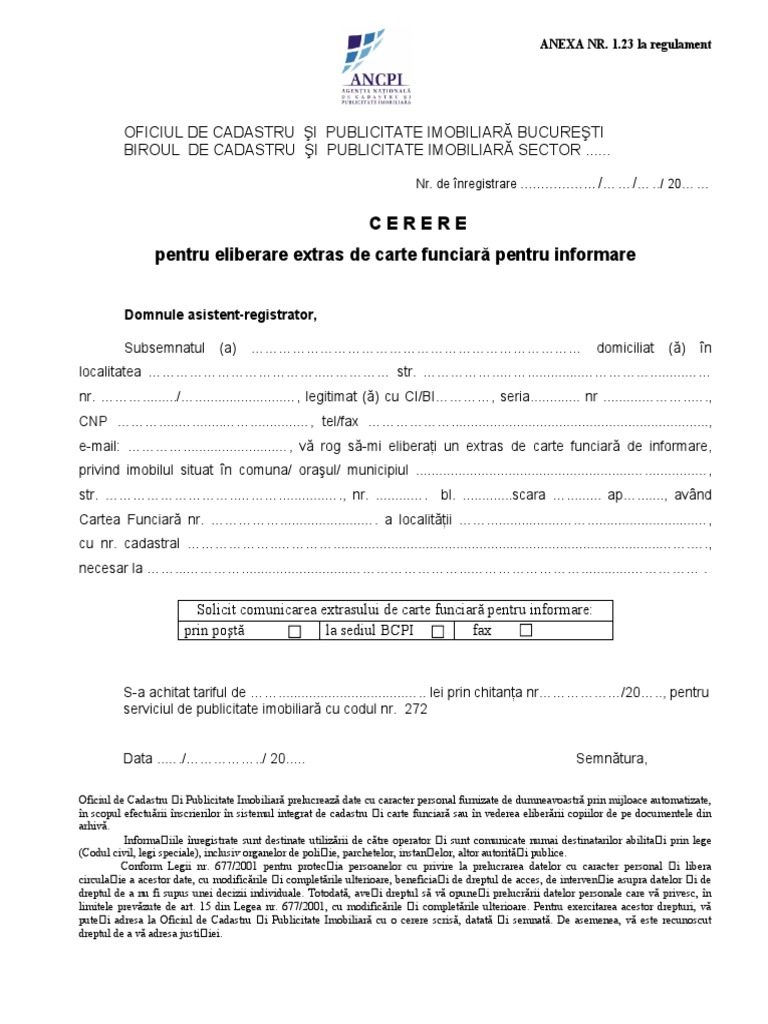 vizitati articolul complet aici : http://www.tdownsdustlessblasting.com/model-cerere-solicitare-extras-carte-funciarasibiu Extrasul de carte funciară pentru informare. Pentru extrasul de carte funciară de informare, solicitantul trebuie să plătească 20 de lei, iar plata se poate face cu ajutorul cardului. Extrasul de carte funciară prezintă informații din cartea funciară și poate fi de trei tipuri: